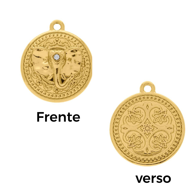 Pingente Medalha Elefante Ouro com Strass Cristal 20mm. Medalha trabalhada com detalhes na frente e no verso, detalhes que lembram correntes e um elefante em destaque. No centro, um strass cristal traz brilho sofisticado, ideal para colares, pulseiras e chokers com significado e estilo.